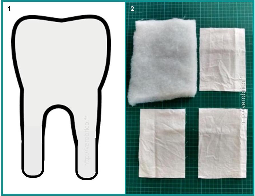 Dans un premier temps, il vous faut un patron en forme de dent. Comme je ne sais pas dessiner, j’ai pris une image sur internet que j’ai dans un premier temps agrandit (15 cm de haut). Puis j’ai élargi la racine afin de faciliter la mise sur l’endroit de la dent (photo n° 1). Après impression sur papier de mon patron, j’ai découpé à ses dimensions de la ouate de 2 cm et 3 pièces de tissu blanc (oui, mes dents sont propres !) (photo n° 2).