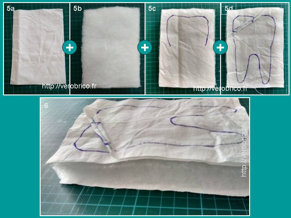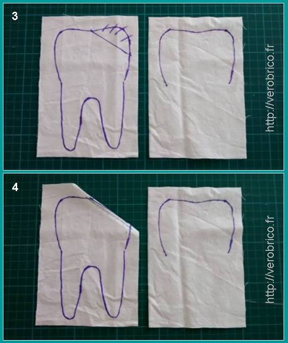 Le patron est reporté de manière partielle et entière sur 2 des pièces de tissu (photo n° 3) et un angle de la dent est rabattu et ourlé pour faire l’ouverture de la poche à dents de lait (photo n° 4).