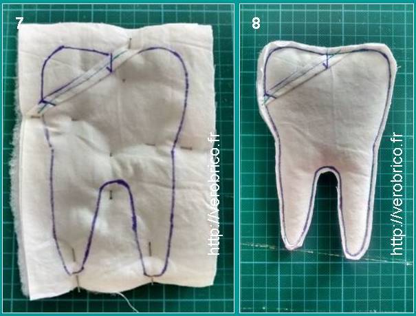 Le mille-feuilles est épinglé et on peut désormais coudre entièrement l’ensemble en suivant le contour de la dent (photo n°7) puis le pourtour est découpé en gardant 2 à 3 mm de marge extérieure (photo n°8).