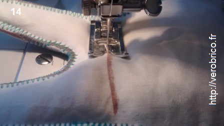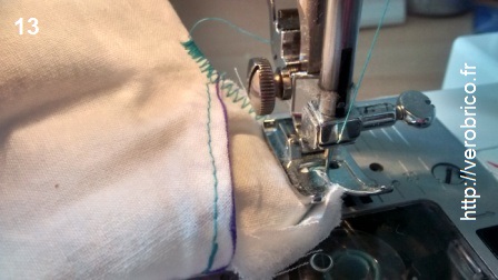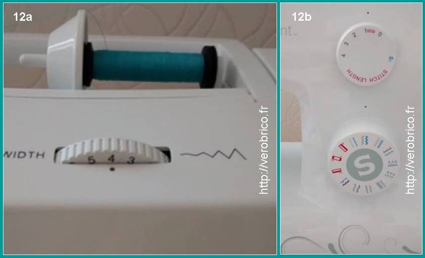 Pour cacher ce « détail » disgracieux, ainsi que pour éviter que le tissu se délite, une couture zigzag est réalisée sur tout le contour de la dent. Les photos n°12 montrent mes réglages machine et la photo n°13 le résultat de la couture (mettez vous bien sur le bord de votre ouvrage).