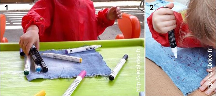 Pour faire une surprise, les enfants ont dessiné sur le jeans (découpé dans un vieux pantalon cassé) Les stylos n’étant pas vraiment adaptés pour des petits bonshommes de moins de deux ans, il faut rester très vigilant et mettre la blouse pour protéger les vêtements. Pour fixer les dessins sur le tissu j’ai suivi les indications renseignées sur les feutres.