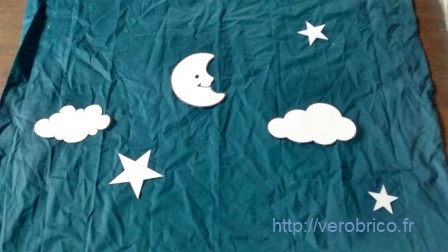Ne sachant pas dessiner, j’ai cherché sur interne des motifs qui me plaisaient et que j’ai ensuite découpé. Je suis restée dans la simplicité avec un thème céleste qui incitera un bon sommeil  :