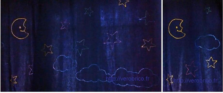 customisation_rideaux_ikea_verobrico (2)Une fois mes petites découpes terminées, les différents motifs sont reportés sur les rideaux grâce à un feutre lavable à l’eau :customisation_rideaux_ikea_verobrico (3)Puis avec un point zigzag, les contours des motifs sont piqués à la machine à coudre. A noter que pour l’œil de la lune, un petit rond de tissu jaune a été cousu :
