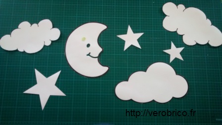 Ne sachant pas dessiner, j’ai cherché sur interne des motifs qui me plaisaient et que j’ai ensuite découpé. Je suis restée dans la simplicité avec un thème céleste qui incitera un bon sommeil  :