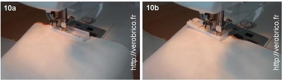 kit_bebe_verobrico (9)Une grosse difficulté a été rencontrée lorsque j’ai cousu le coton et l’alèse ensemble. L’assemblage est réalisé endroit du coton sur endroit de l’alèse avec le coton en dessous de l’alèse. Le pied presseur de la machine est donc sur la face plastifiée. Problème, le pied ne glisse pas sur le plastique et le tissu n’avance pas. Ma solution a été d’utiliser le pied en plastique servant à faire les boutonnières mais j’aurai pu acheter un pied en téflon (photo n°10a). Avec les pieds en plastique, plus de problème d’accroche mais faite bien attention à repositionner le pied à boutonnière dès qu’il se trouve en butée (photo n°10b). Une autre solution proposée par Clotilde est de conserver le pied classique et de scotcher avec du scotch brouillé (non transparent) la face plastifiée sur la ligne de couture. Bien que je n’ai pas testé cette méthode, je lui fais confiance 😉