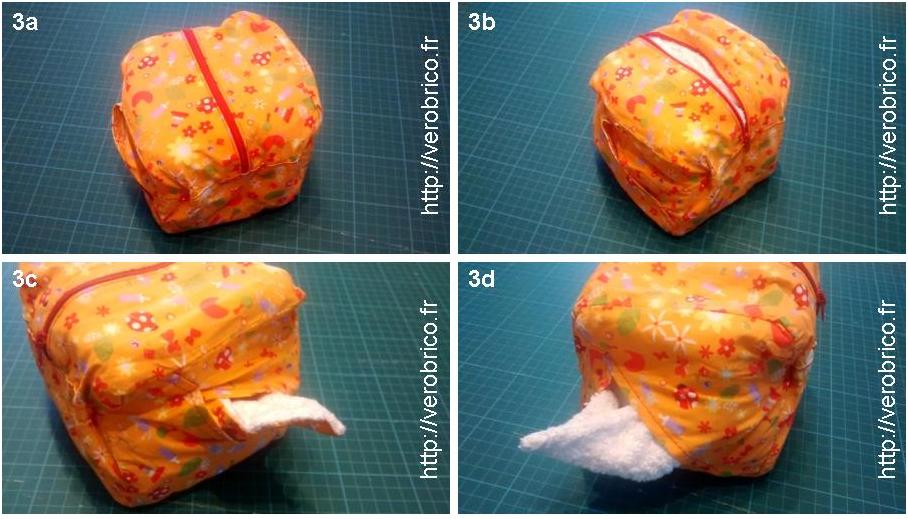 Pour me simplifier la vie, j’ai opté pour une double distribution avec d’un côté un dévidoir à lingettes bambou-coton et de l’autre un dévidoir à lingettes bambou-bambou (photos 3c et 3d). Autre option ajoutée, une fermeture éclair centrale pour recharger facilement le distributeur (photos 3a et 3b).
