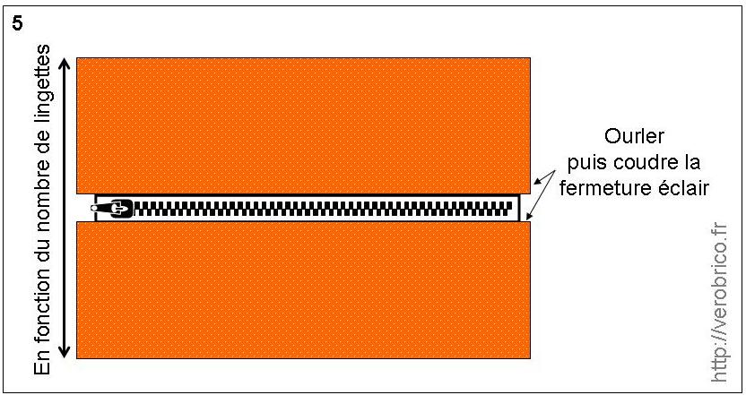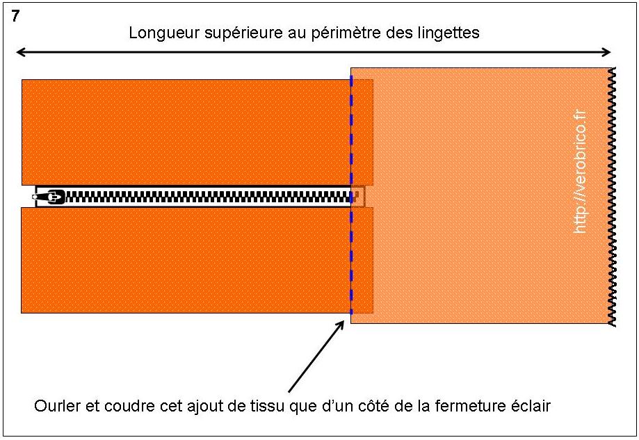 kit_bebe_verobrico (6)c. Désormais il faut ajouter une pièce de tissu à l’une des extrémités de la fermeture éclair. Fermeture éclair + ajout de tissu doit avoir une longueur supérieure au périmètre d’une lingette (prendre en compte une marge de couture).