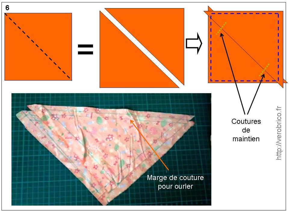 L’hypoténuse de chaque triangle est ourlé puis les triangles sont superposés comme l’illustre le schéma n°6 (dessin de droite). Deux petites coutures perpendiculaires (pointillés verts) à la supposition des triangles sont réalisées afin de les maintenir ensemble. La seconde utilité de ces coutures est de fermer un peu le dévidoir afin que les lingettes ne sortent pas d’elles-même.