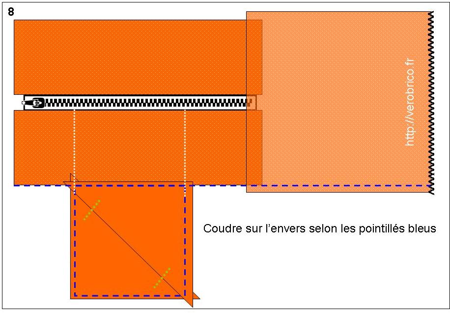 kit_bebe_verobrico (7)d. Assemblage sur l’envers. Comme le montre le schéma n°8, les dévidoirs sont assemblés l’un après l’autre aux pièces du schéma n°7. Un côté du dévidoir est centré par rapport à la fermeture éclair (pointillés blancs) puis il est cousu selon les pointillés bleus. Cette opération est répétée pour le second dévidoir.