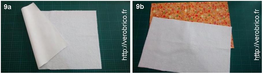 Le tapis à langer ressemble énormément à la serviette de bain. Ses dimensions : 50×30 cm². La principale différence réside dans le fait qu’il faut un tissu plastifié pour obtenir un tapis étanche. La photo n°9a présente un bout d’alèse plastifiée coupé aux dimensions du tapis. Pour garder le thème du nécessaire de naissance, l’alèse est doublée avec le tissu coton utilisé par avant (photo n°9b).