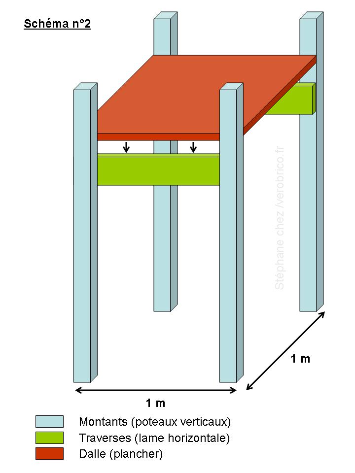 Ayant acheté une dalle (plancher) de 1 m x 1 m, les traverses ainsi que l’écartement entre les armatures en « H » doivent être ajustées à ces dimensions afin que la dalle repose parfaitement sur cette structure (schémas n°1 et n°2).