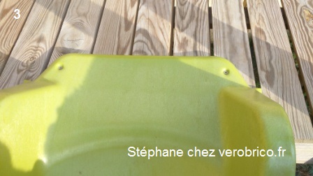 Le toboggan (glissière) est simplement vissé sur la dalle (photo n°3) et pour la sauvegarde des petits doigts, il est conseillé de fixer la partie basse du toboggan au sol 😉
