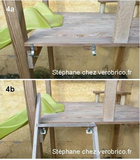 Puis fixer les attaches de l’échelle de mezzanine (photo 4a). L’échelle étant trop grande, découpez le haut de l’échelle et accrochez-la à ses fixations (photo 4a).