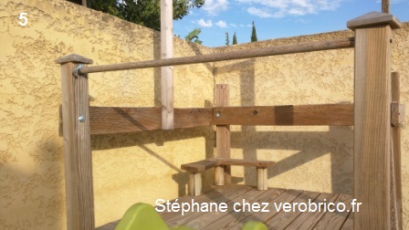 – Côté toboggan, fixez une barre à 60 cm du plancher, soit quasi en haut des poteaux (photo n°5).