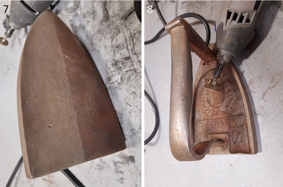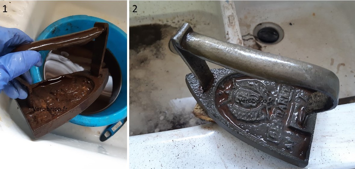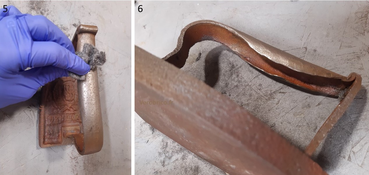 Après ponçage, Photos 6 et 7, je pensais me laisser quelques jours avant de commencer la rénovation du plateau mais après une petite bêtise le plateau a été taché par des résidus d’eau (Photo 8) ! Dans un premier temps, j’ai suivi les conseils de Vérobrico i.e., avec une éponge humide… frotter (doucement) et encore frotter (doucement) (Photos 9 et 10). Ouf ! j’ai réparé ma bêtise !
