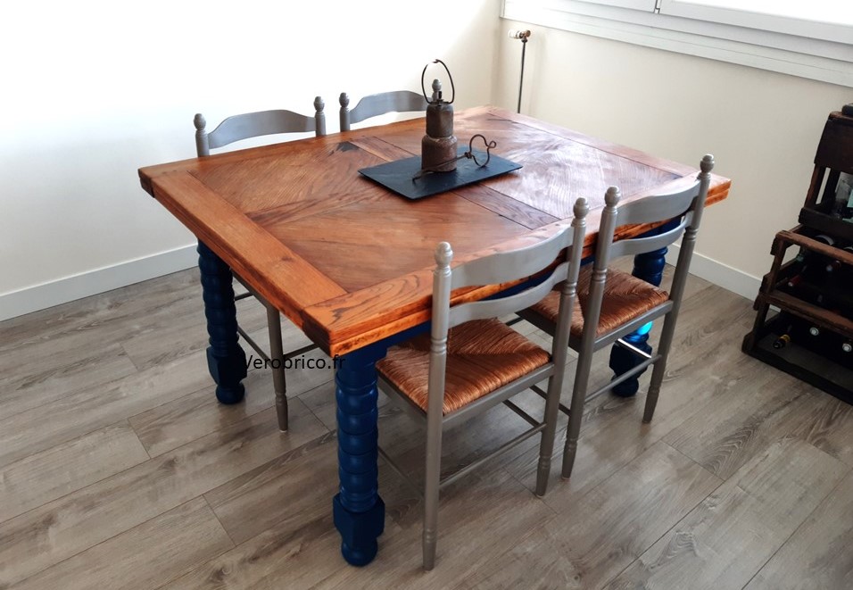 Je dois avouer que je ne souhaitais pas que la table soit autant foncée mais au final ça fait très sympa avec le piétement bleu. Maintenant, il faut que je change les chaises ! 😉