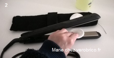 Les shampoings et les crèmes (etc.) ont graissé peu à peu les plaques du fer à lisser. Pour le nettoyer sans l’abîmer, j’utilise :
