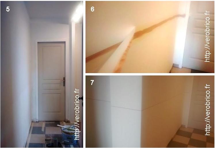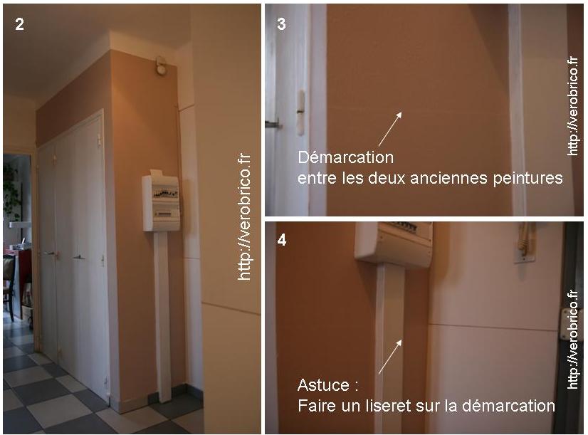 Un test peinture se faisant toujours sur une petite surface, le premier coup de rouleau est donné sur le placard. Comme le montre la photo n°3 la démarcation entre les deux anciennes peintures du couloir n’est pas masquée par la nouvelle peinture. Nous avons poncé le mur, appliqué plusieurs couches de peintures sans que le problème soit résolu. Que faire ?