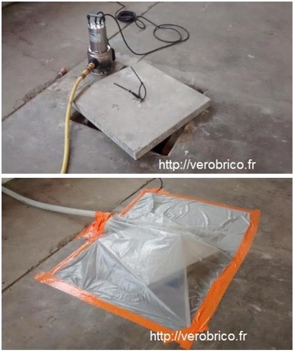 2 jours plus tard, installation temporaire d’une pompe de relevage pour nous relier au tout-à l’égout (2h d’intervention). Comme le système est temporaire la trappe de la fosse septique reste ouverte. Toutefois comme la pompe se déclenche lorsqu’un certain niveau de remplissage est atteint, une bâche étanche est scotchée pour éviter les mauvaises odeurs (avec les chaleurs de l’été, je peux vous dire qu’on a dû quitter notre chambre tellement l’odeur était forte !) ;