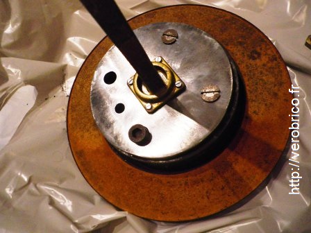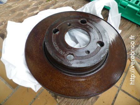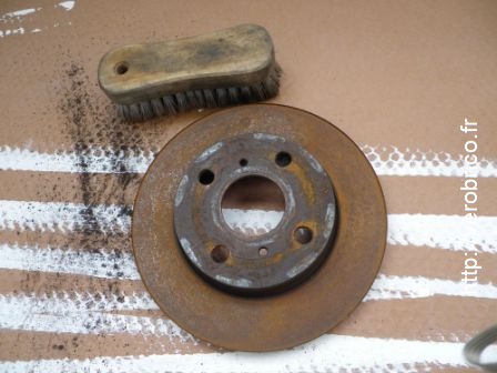Bien que la rouille soit superficielle car pas très vieille, j’ai tout de même pris la précaution d’éliminer l’eau présente à la surface du disque de frein (conseil du CDB) en le passant au four 40 min à 140 °C. Je ne pense pas que cette étape soit primordiale mais bon faisons les choses proprement.
