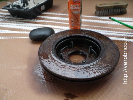 Retirer le produit par voie chimique serait une complication supplémentaire qui détériorerait la rouille. Je garde donc patience et laisse sécher le disque dans un endroit aéré et sec.