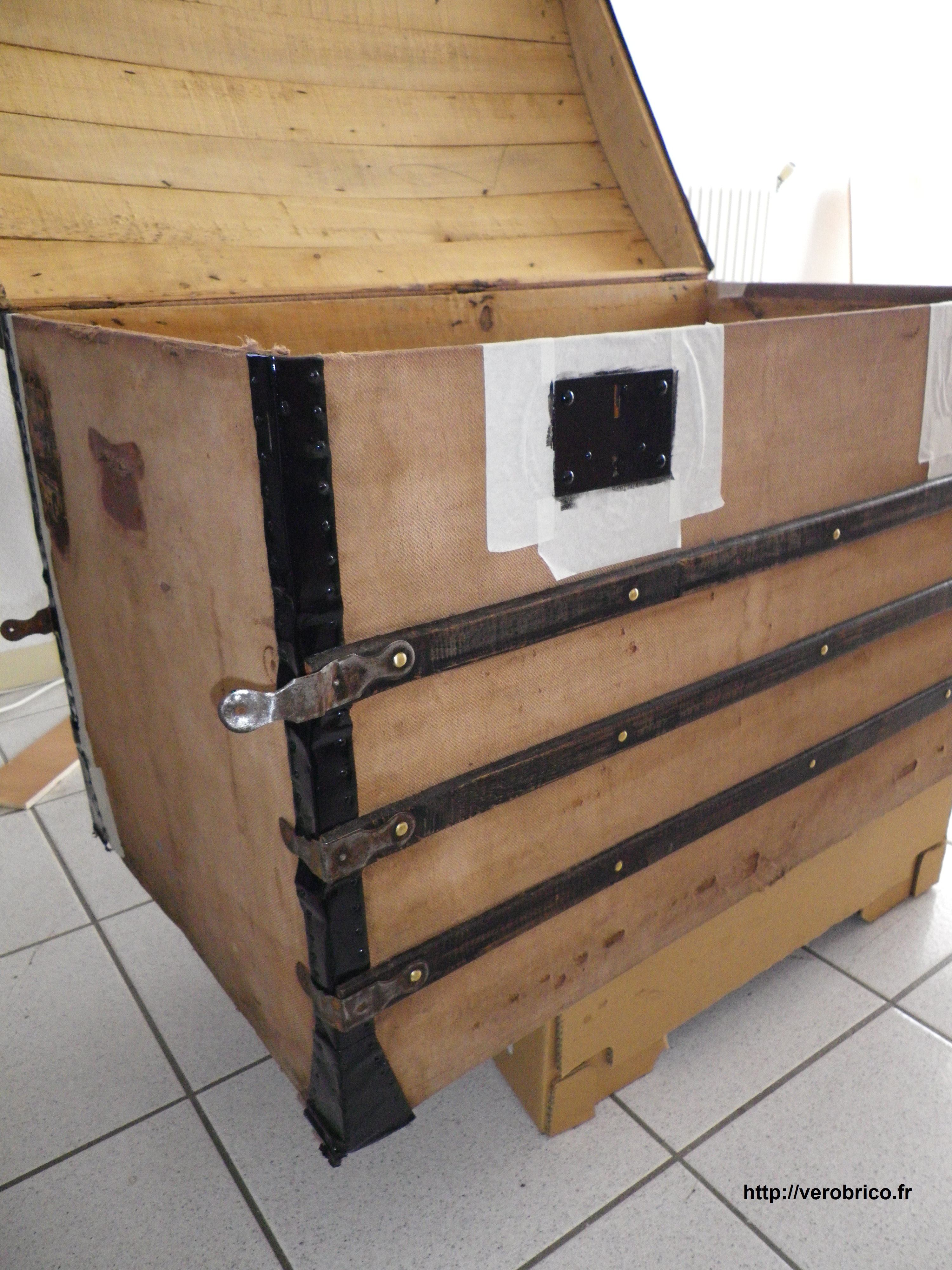 La protection métallique des angles inférieurs de la malle sont pliés à coup de marteau. Puis, après avoir nettoyé, traité et peint au brou de noix le cadre de bois qui maintenait l’ensemble de la malle et qui faisait office de pied, les planches le constituant sont remises en place et clouées avec des clous de tapissier.