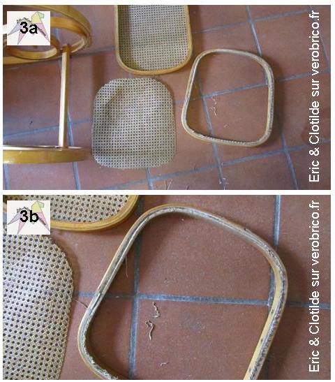 Pour retirer le cannage, on a commencé à tout découper au cutter avant de finir de retirer tous les petits morceaux coincés dans la rainure du cadre de l’assise (photo n°3b).
