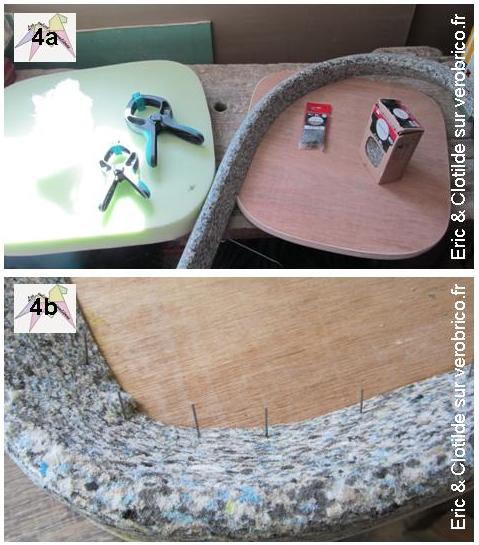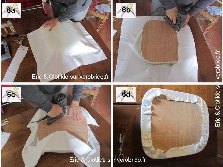 Une fois le tissu déposé sur l’assise, on retourne la planche et on agrafe. On commence par les côtés puis par les angles en tendant bien le tissu mais pas trop non plus sinon ça casse (photos n°6b).