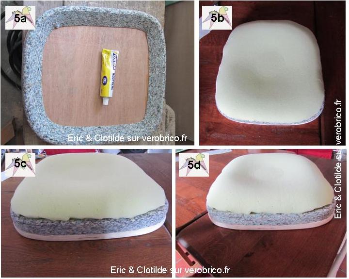On en rencontré un petit problème avec la mousse qui se soulevait au centre. On a donc placé une planche avec des poids pour être sûr qu’elle se collerait à la planche en son centre (photo 5d).