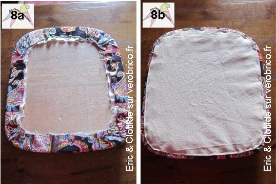 Il n’y a plus qu’à faire de même avec le tissu définitif. Plus votre tissu sera épais, et plus vous allez galérer à faire de jolis plis dans les angles mais qui dit tissu épais, dit meilleure résistance dans le temps (photo n°8a).