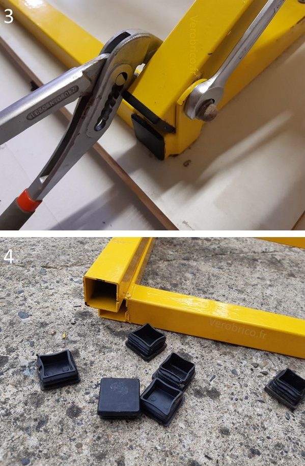 Dans un premier temps, le plateau est démonté, les vis de l’articulation du plateau et les vieux embouts (pour la modification d’angle) sont retirés.
