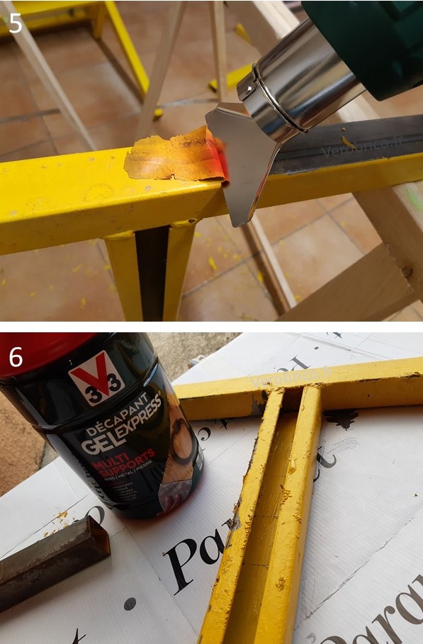 J’ai d’abord voulu éliminer la peinture avec un décapeur thermique (Photo 5). Cette technique fonctionne mais reste fastidieuse et très lente…Pour être plus efficace, le décapage a finalement été réalisé avec un gelExpress multi-support 3V3 (18,90€). Malgré l’efficacité du décapant, cette étape a duré plusieurs jours. Pensez aux gants de protection et à travaillez dehors ou dans une pièce bien aérée. La peinture est grattée et retirée au fur et à mesure avec une spatule.