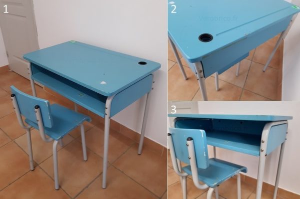 Mes garçons grandissent et demandent un bureau pour s’isoler dans leur bulle et faire leurs activités découpage, coloriage ou petits jeux au calme. J’ai trouvé les deux bureaux dans deux Emmaüs différents. Celui qui fait l’objet de cet article est un petit bureau de maternelle peu profond car la chambre est munie de grands placards qui ne laissent pas beaucoup de place au mobilier. J’envisage d’ailleurs de cacher un bureau dans l’un des placards lorsque ce bureau deviendra trop petit.