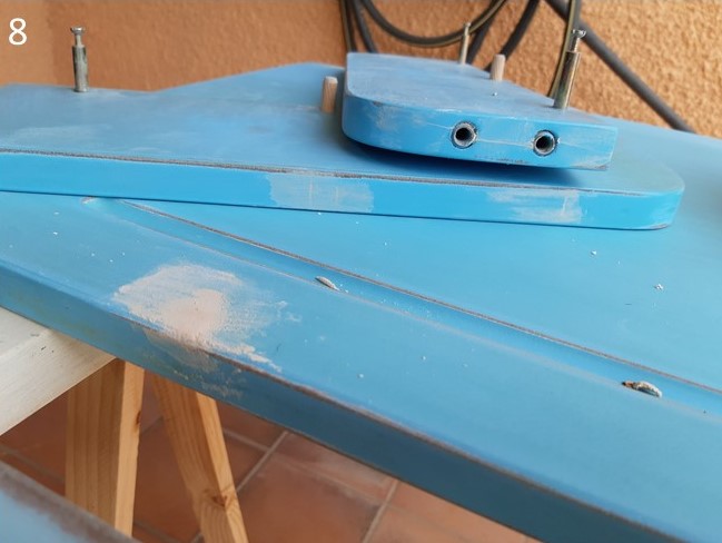Par la suite les planches sont poncées avec du papier de 80 puis de 120. Notez que ma table de ponçage et de peinture est faite de tréteaux et de vieux croisillons de fenêtre. L’installation est très pratique !!